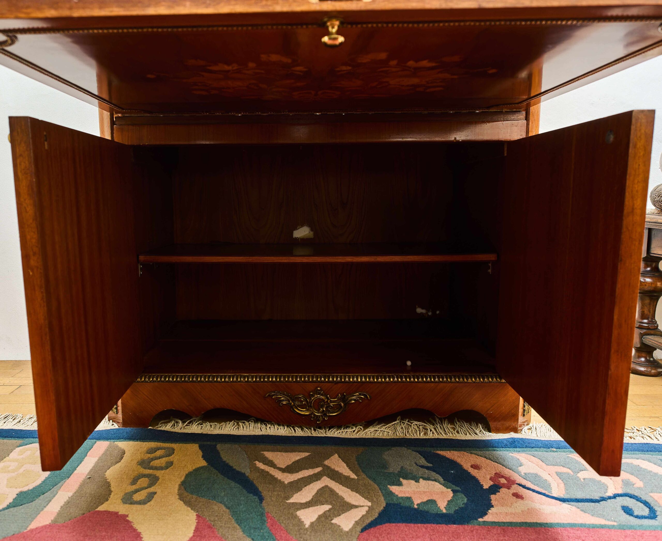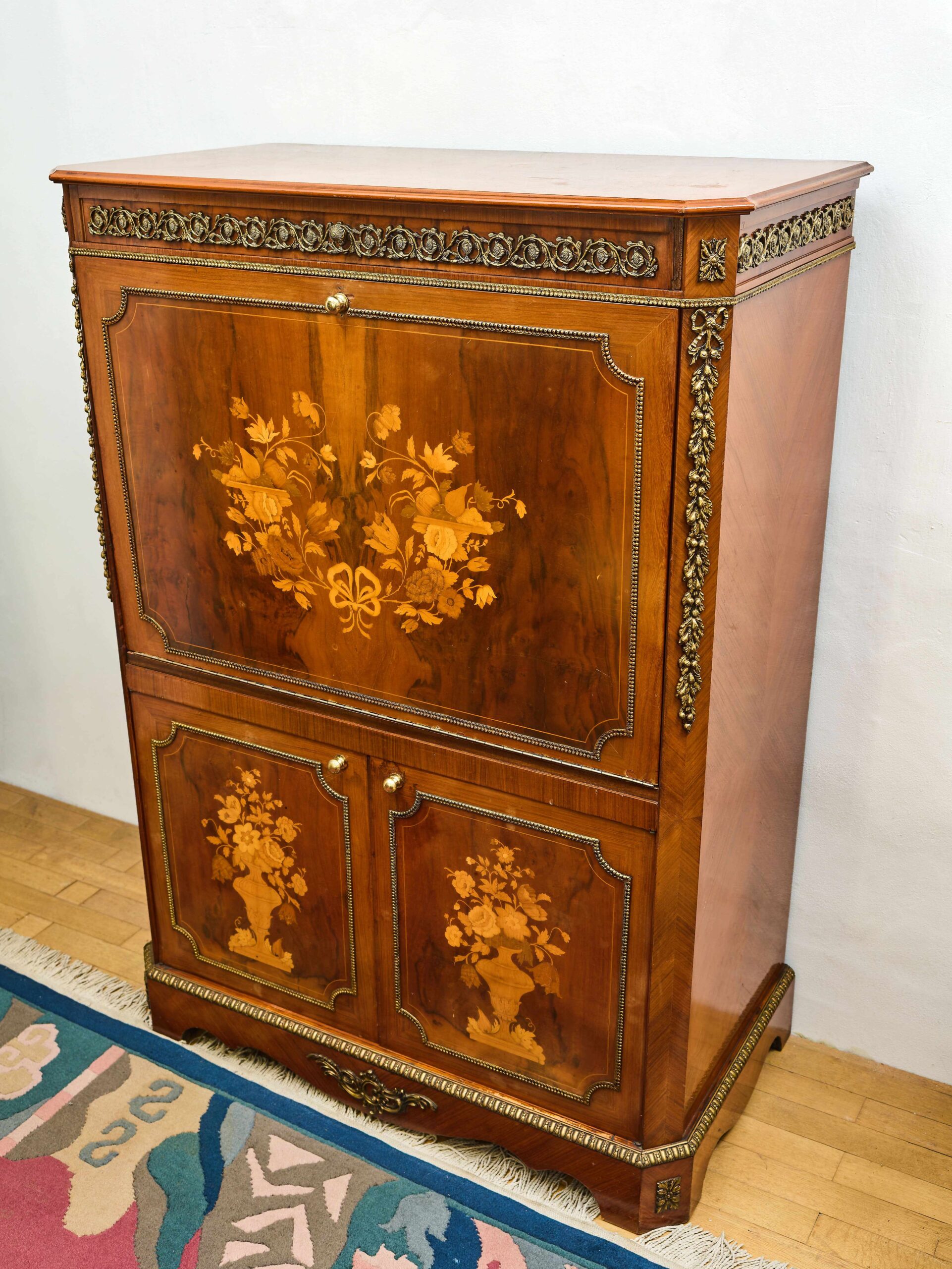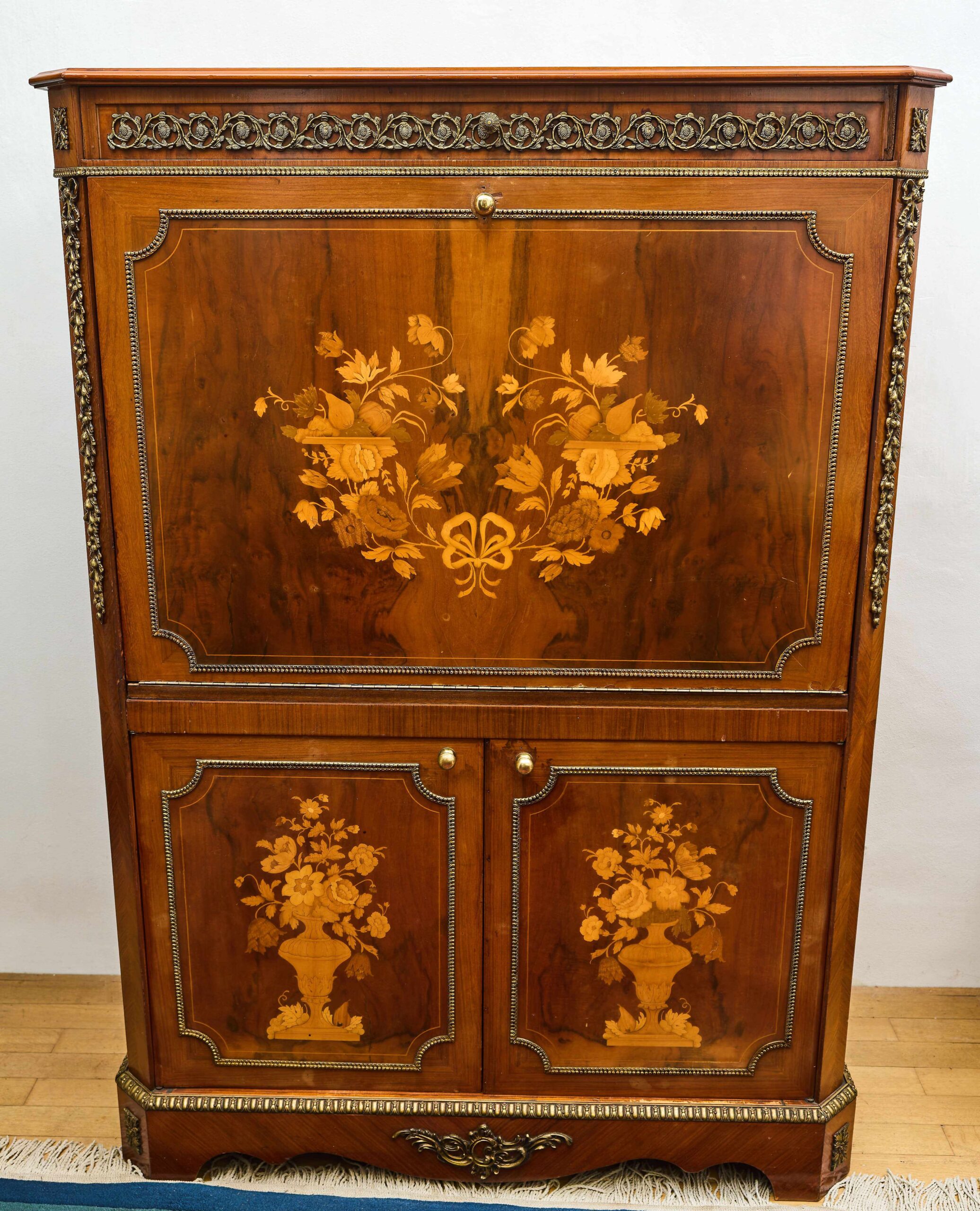Elegant inlated clapsecretist in classicist style Z 19. century is an exceptional example of masterpiece and artistic work. The front is decorated with rich floral inlays with the motif of floral bouquets in decorative vases, that give furniture a representative character. The whole piece is complemented by cast brass ornaments and elaborate ornaments in detail, that underlines its historical origin and aesthetic value. The inner part offers practical storage space, originally adapted for modern use with holes for cabling and ventilation. Despite these modifications, the cabinet remains in very good condition without woodworm and represents an attractive design element suitable for stylish interiors.