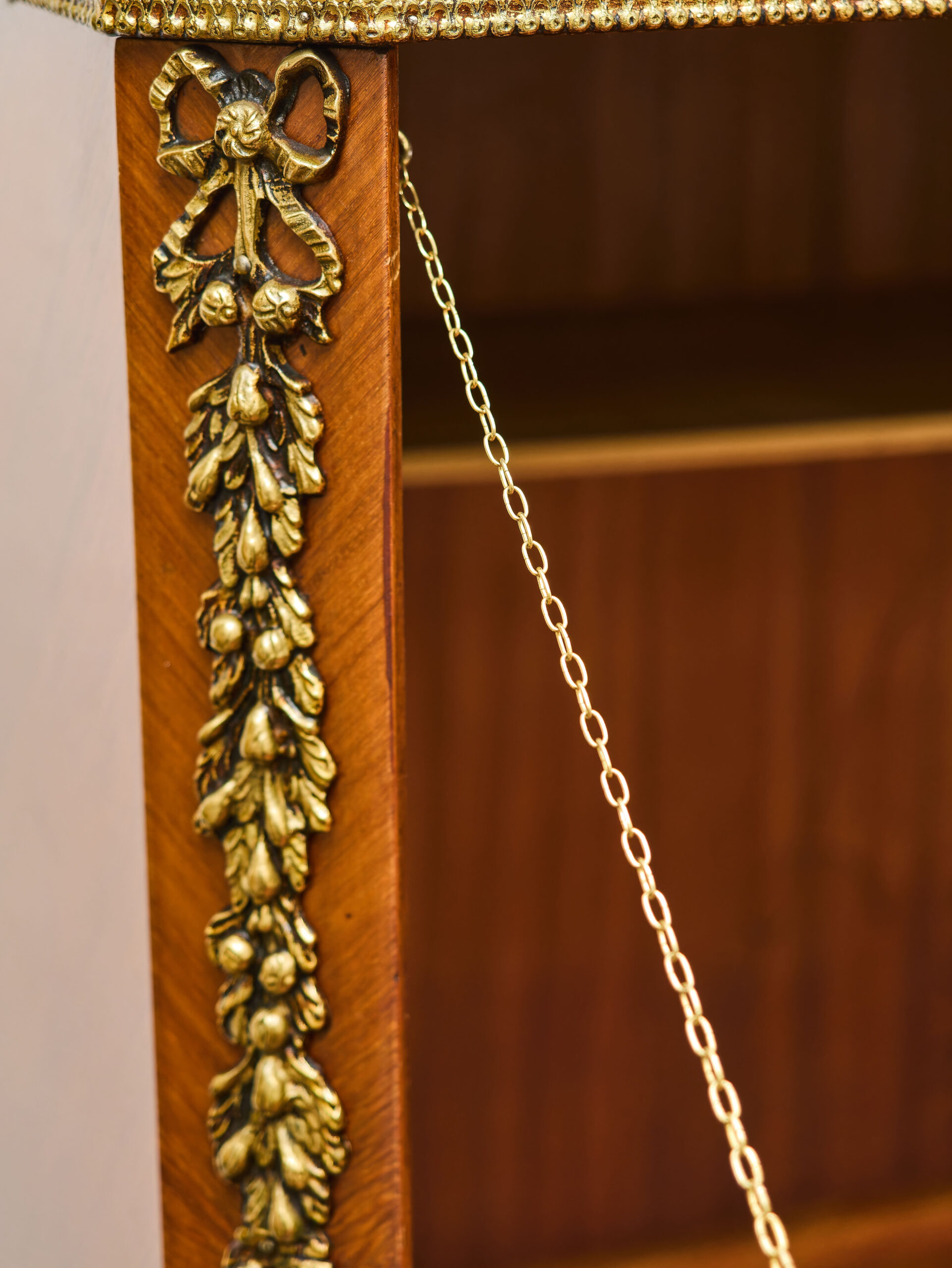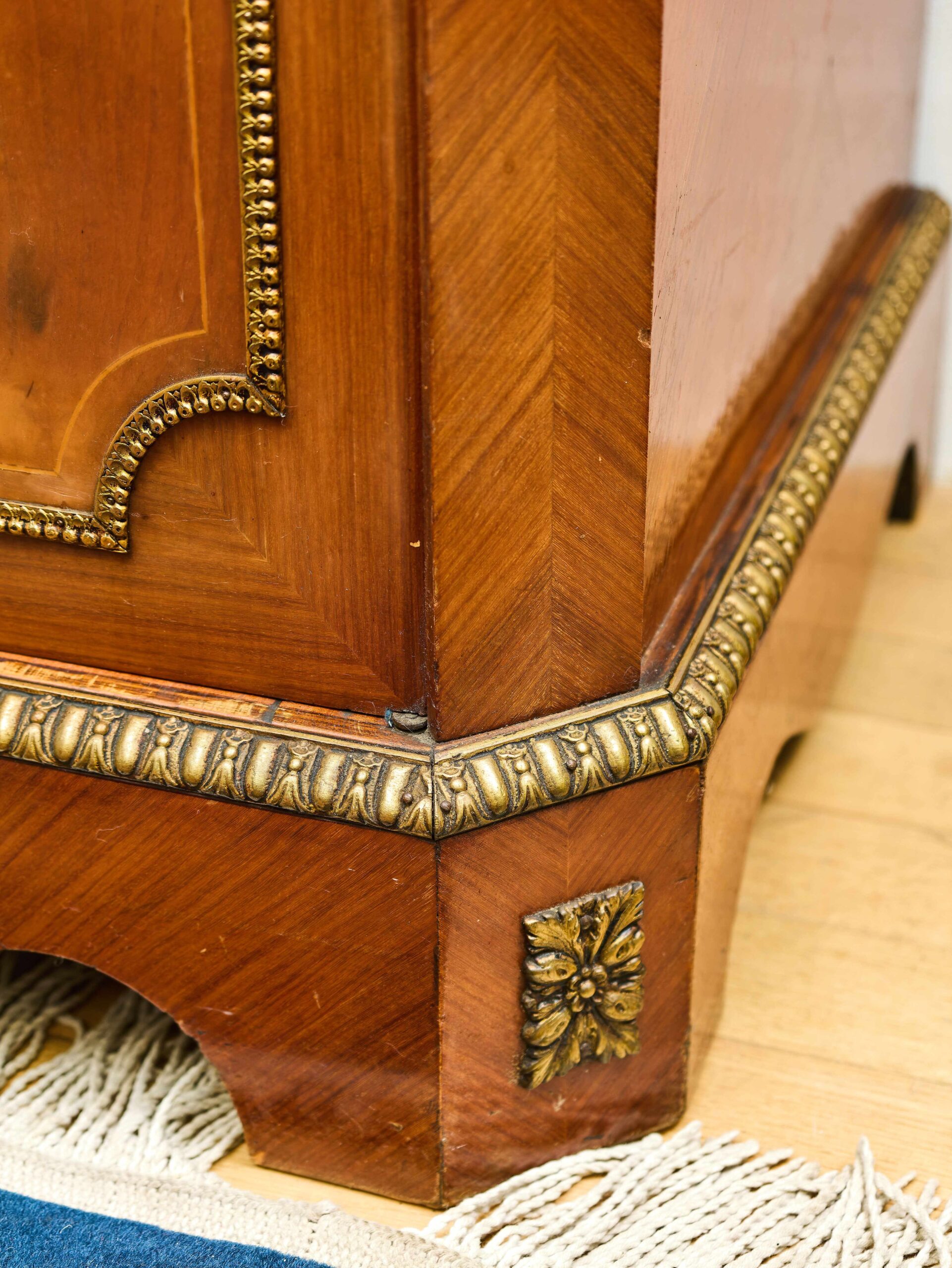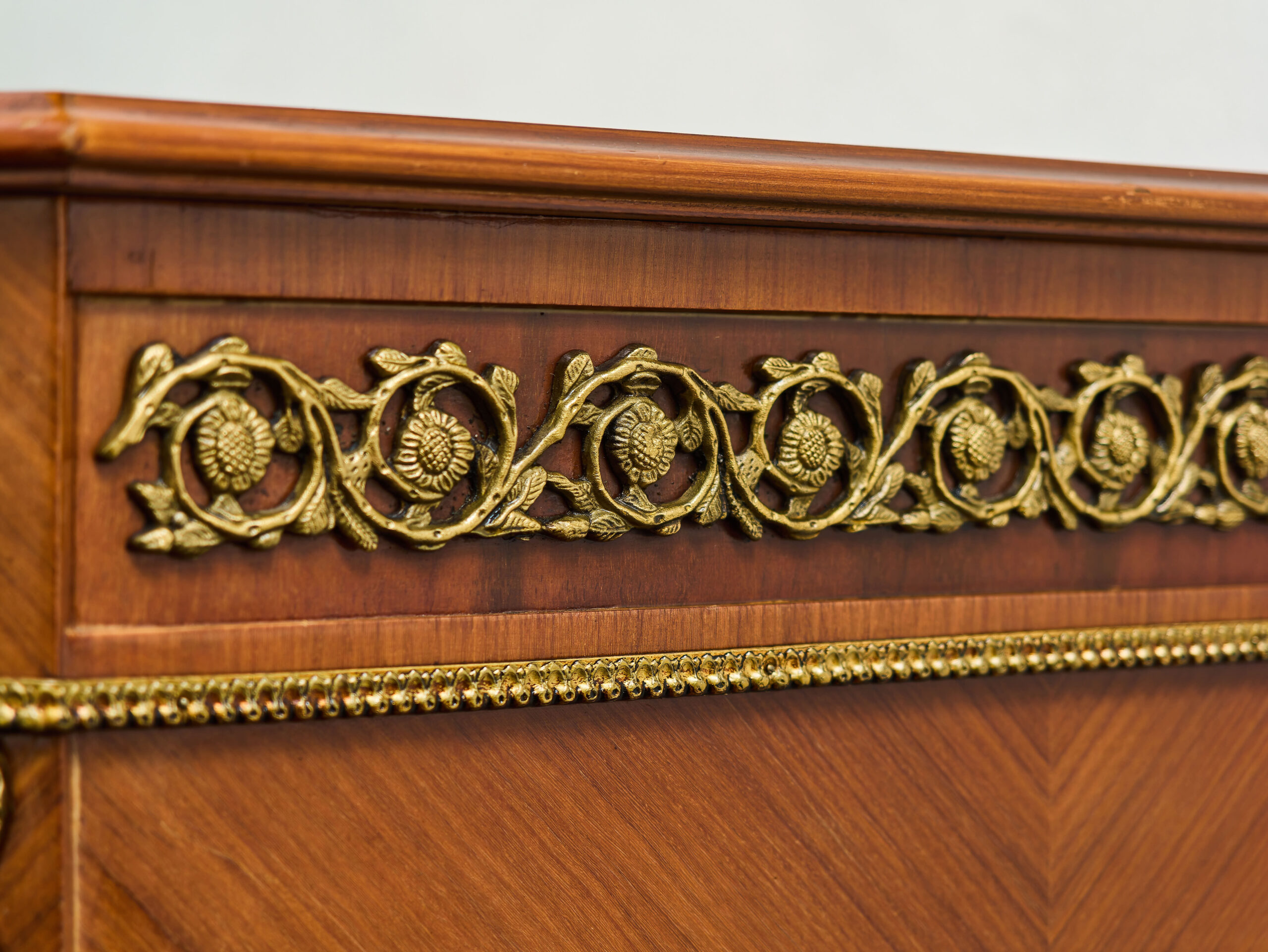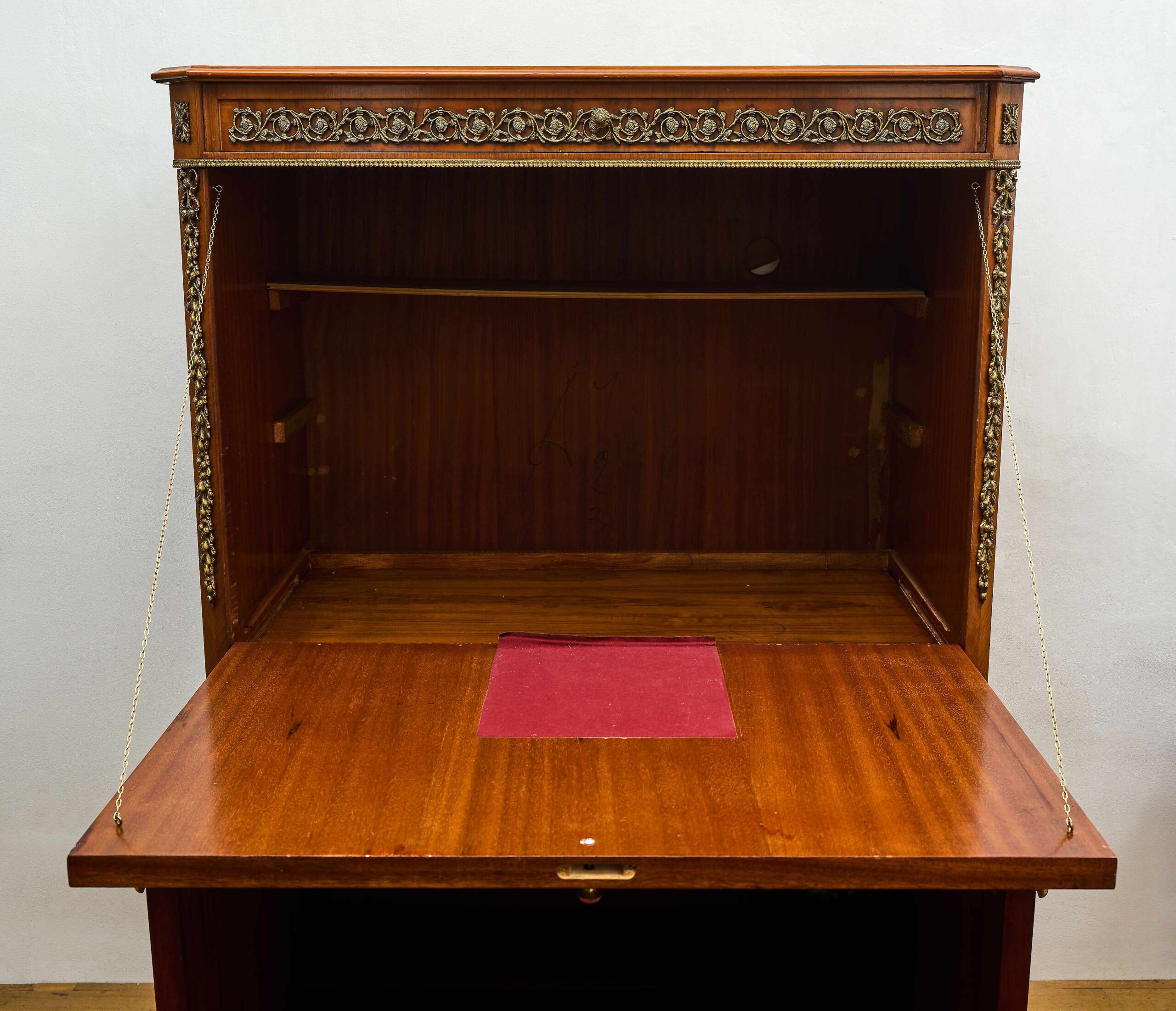 Elegant inlated clapsecretist in classicist style Z 19. century is an exceptional example of masterpiece and artistic work. The front is decorated with rich floral inlays with the motif of floral bouquets in decorative vases, that give furniture a representative character. The whole piece is complemented by cast brass ornaments and elaborate ornaments in detail, that underlines its historical origin and aesthetic value. The inner part offers practical storage space, originally adapted for modern use with holes for cabling and ventilation. Despite these modifications, the cabinet remains in very good condition without woodworm and represents an attractive design element suitable for stylish interiors.