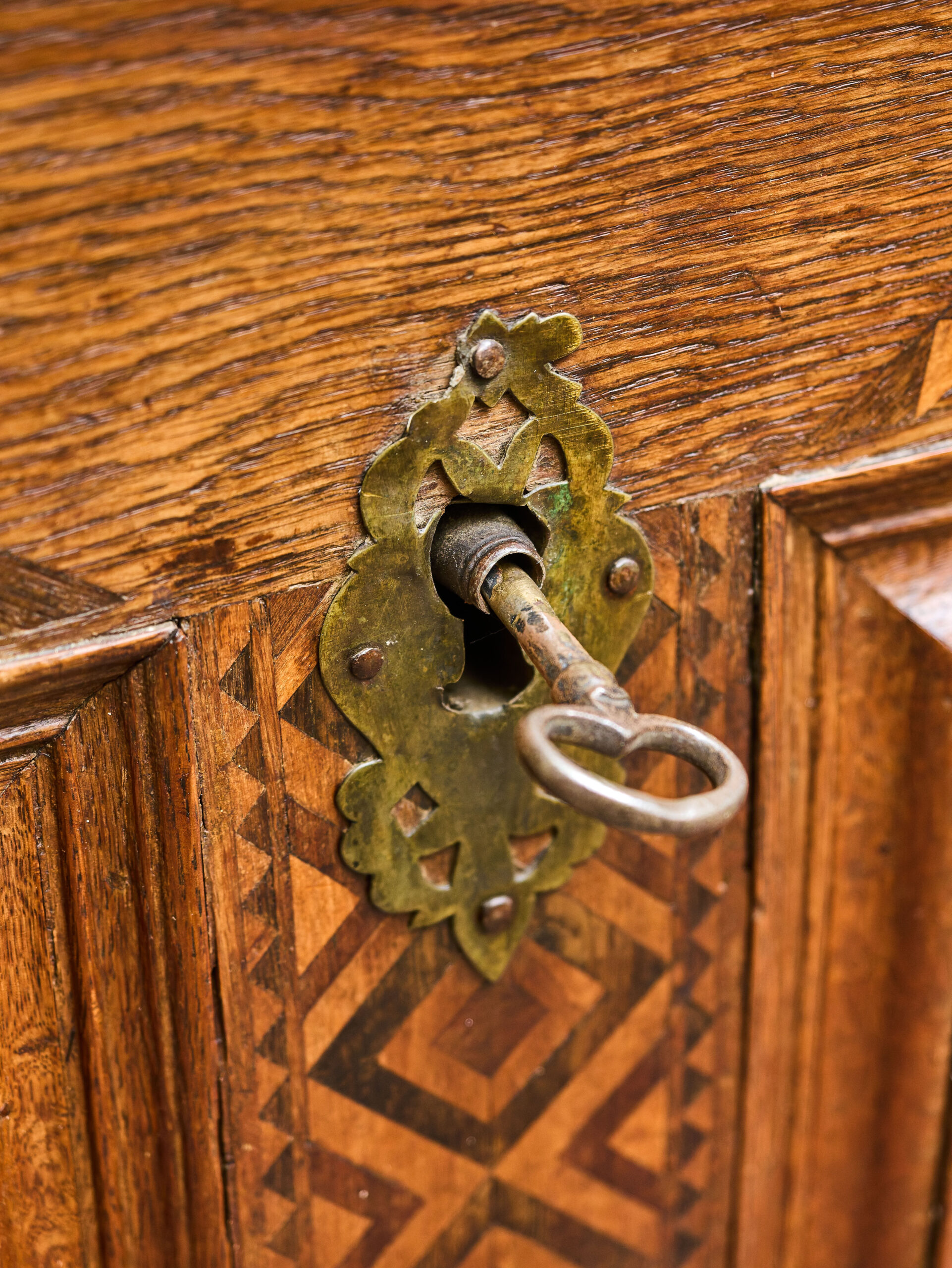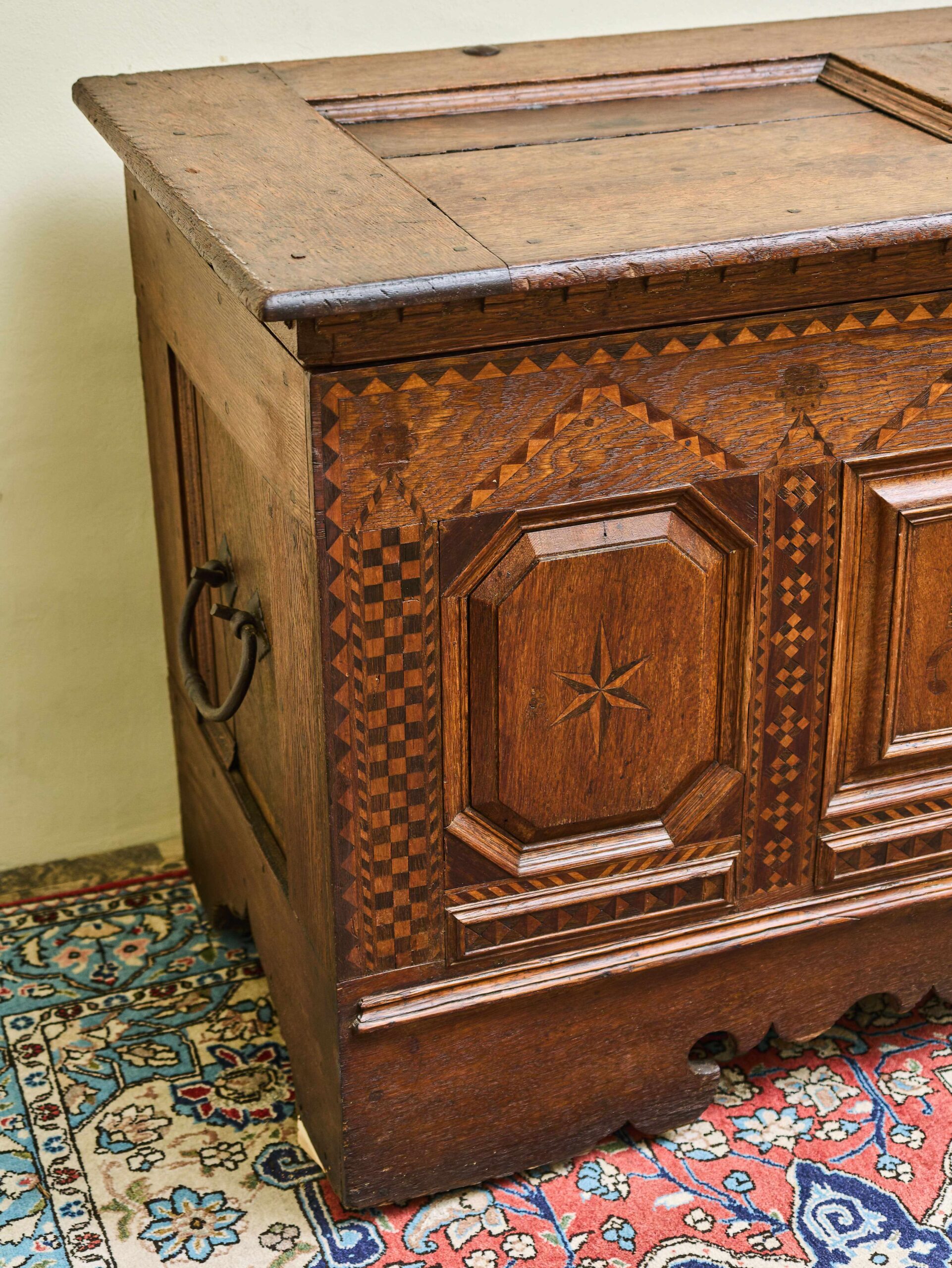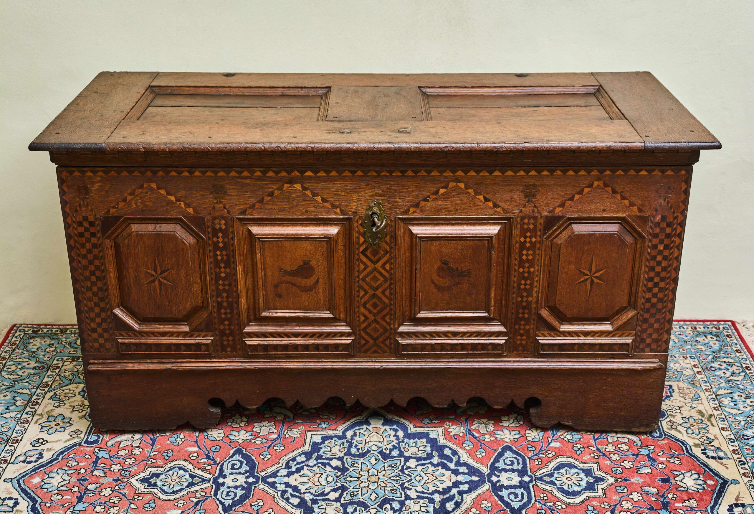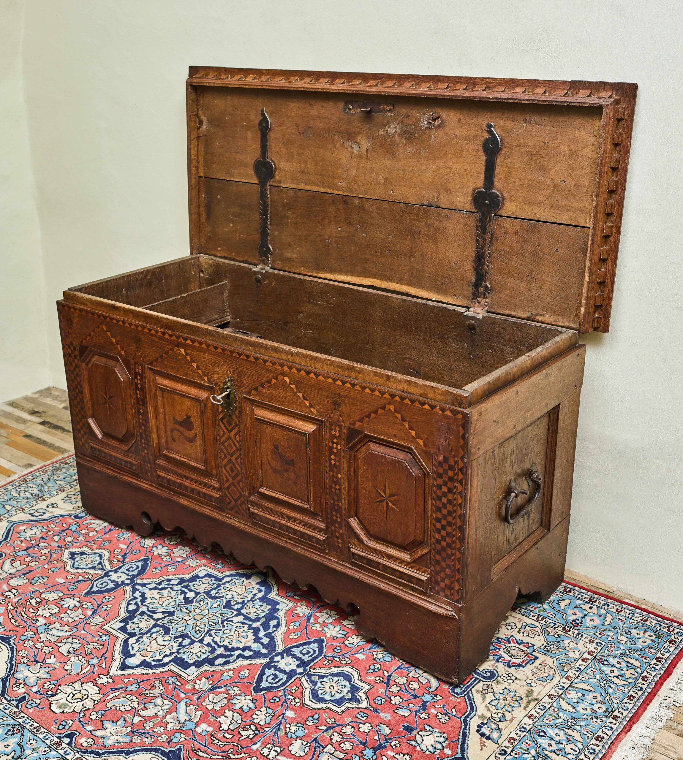 Unikátní intarzovaná truhla z 18. století, která představuje vynikající příklad řemeslného umění své doby. Truhla je vyrobena z masivního dubu. Výzdoba je ukázkou precizního řemeslného umění a smyslu pro detail tehdejší doby. Čelní deska je zdobena bohatou geometrickou intarzií z různých druhů dřev, která vytváří výrazné diamantové a šachovnicové vzory. V jednotlivých kazetách čela se střídají motivy hvězd a stylizovaných ptáků, které symbolizují ochranu a blahobyt. Horní část truhly je lemována dekorativním zubatým pásem, jenž celý kus elegantně rámuje. Celek doplňuje původní ručně kované kování a ozdobné kované závěsy víka, které umocňují autentický historický charakter tohoto výjimečného kusu nábytku. Originální kování, ručně kované hřeby a funkční rozvorový zámek s původním opraveným klíčem zůstaly zachovány v plně použitelném stavu. Díky prostornému vnitřnímu úložnému prostoru a autentickému vzhledu se jedná o vzácný kus vhodný do historických interiérů, stylových rezidencí či jako hodnotný sběratelský artefakt. Stav nábytku je velmi dobrý, bez výskytu červotoče.