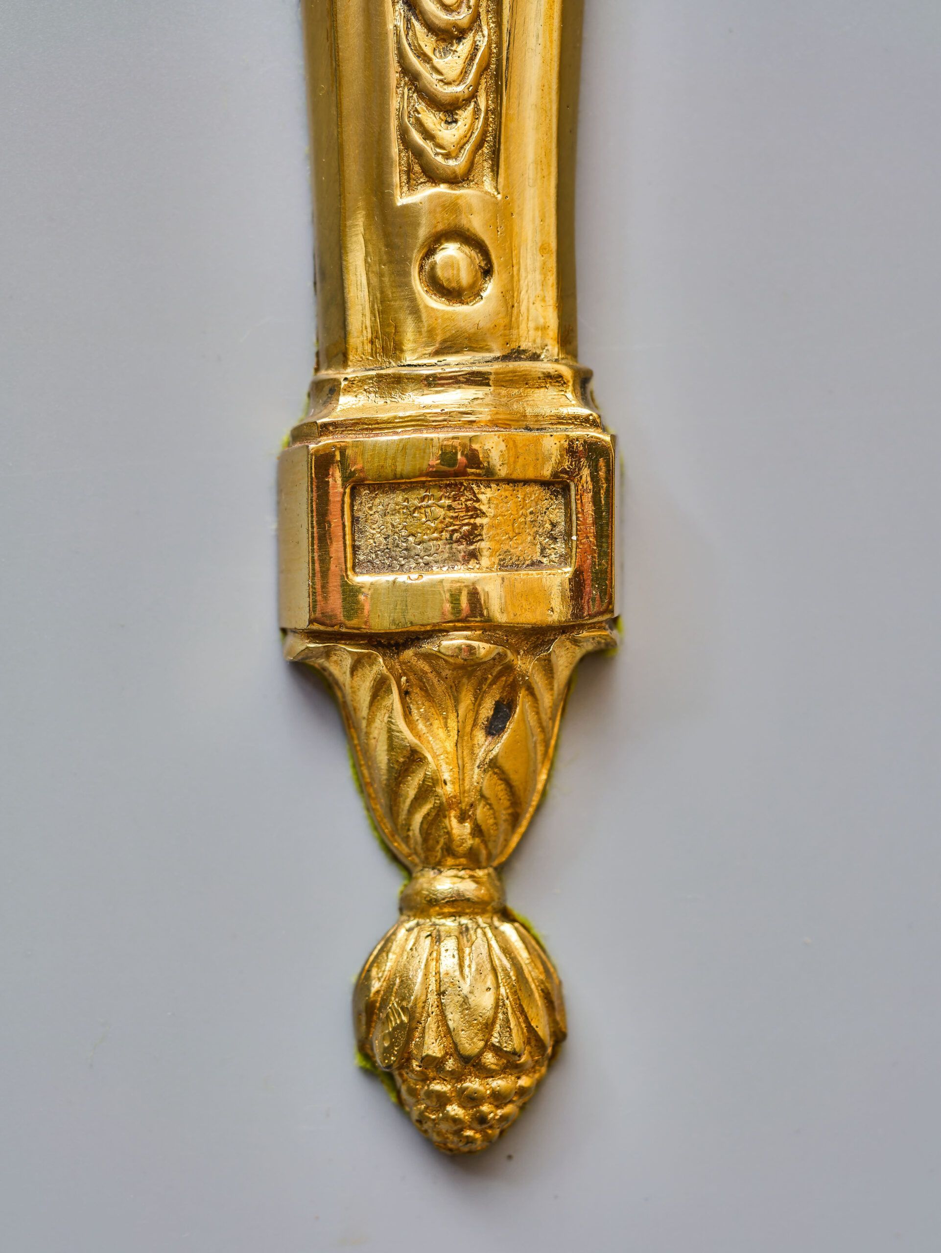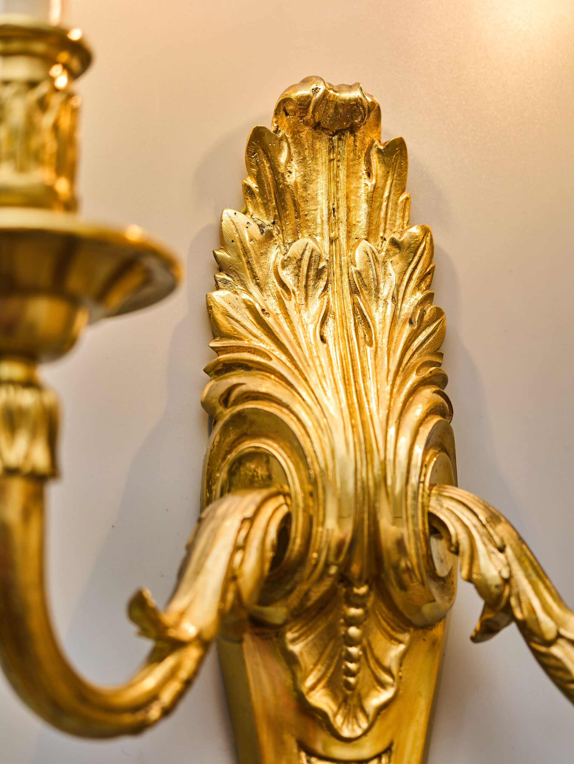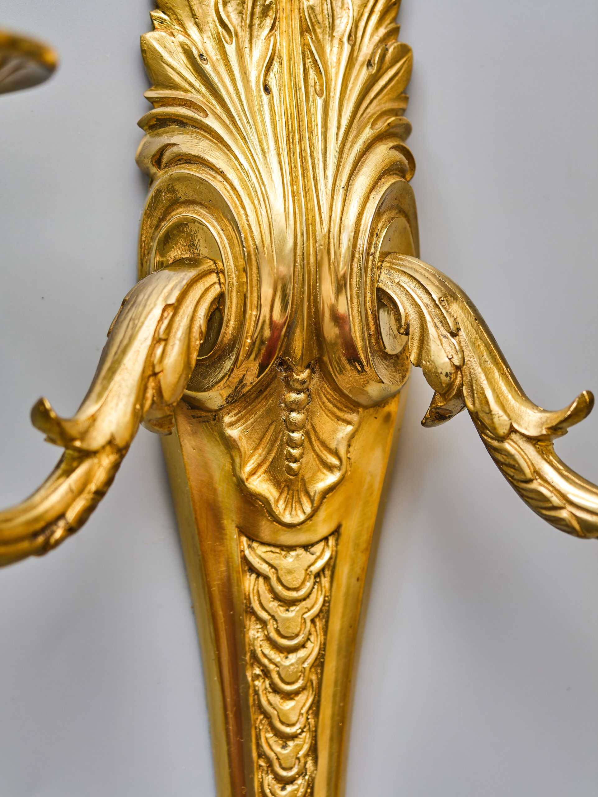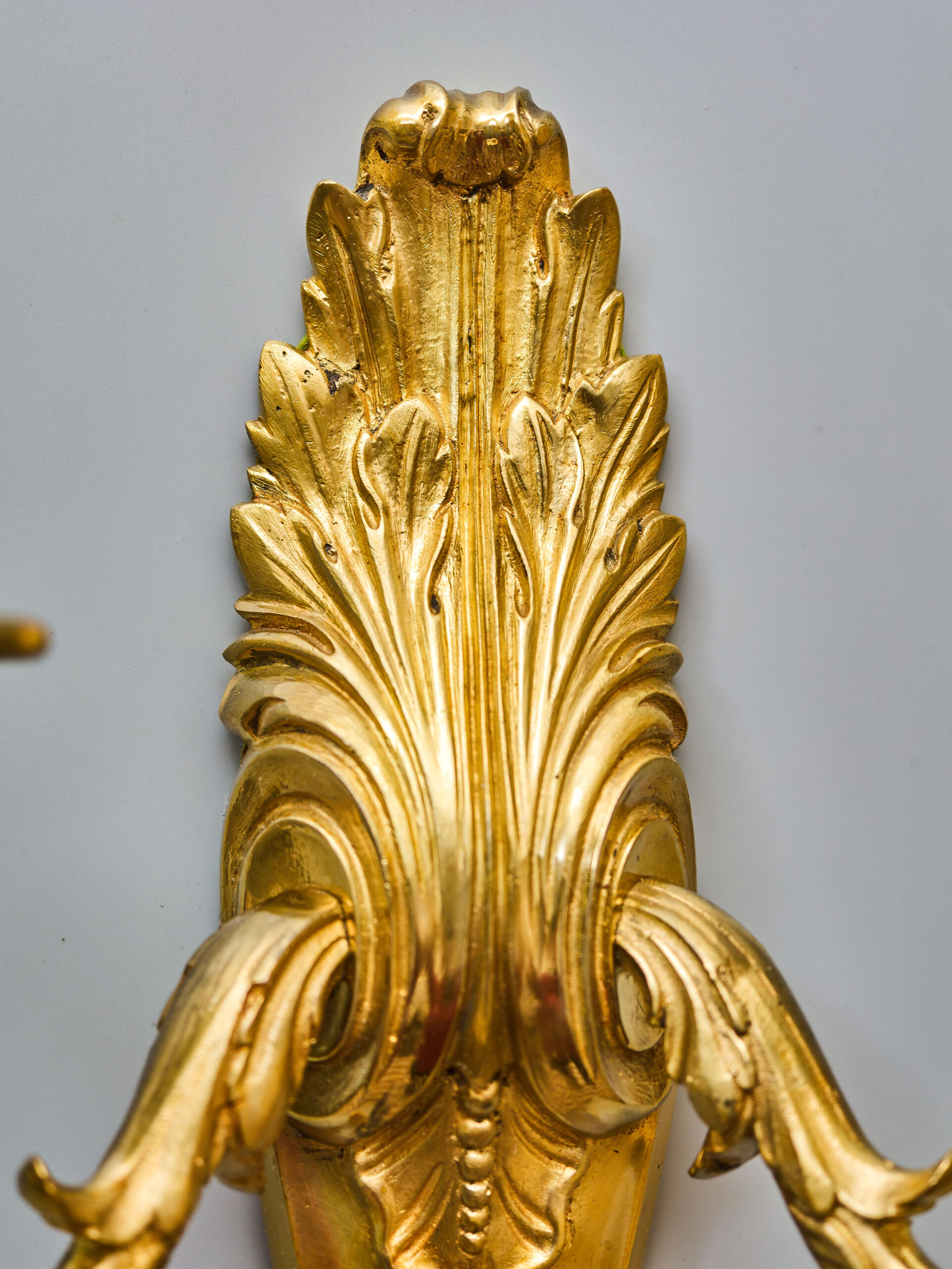 Starožitná nástěnná lampa / aplika z lité mosazi v klasicistním stylu s florálním zdobením. Robustní tělo s velkým akantovým listem, z kterého vycházejí dvě prohnutá ramena nesoucí objímky s žárovkami. Na první pohled zaujme kvalitní provedení ve zlaté barvě s jemnými detaily. Lampa je plně funkční a ihned k užívání. Lampa je na dvě žárovky s klasickým svíčkovým závitem E14 do 40W – vhodné jsou normální, halogenové i lede žárovky do 40W, které nejsou součástí, ale můžeme dodat nebo doporučit nejlepší volbu pro váš projekt.