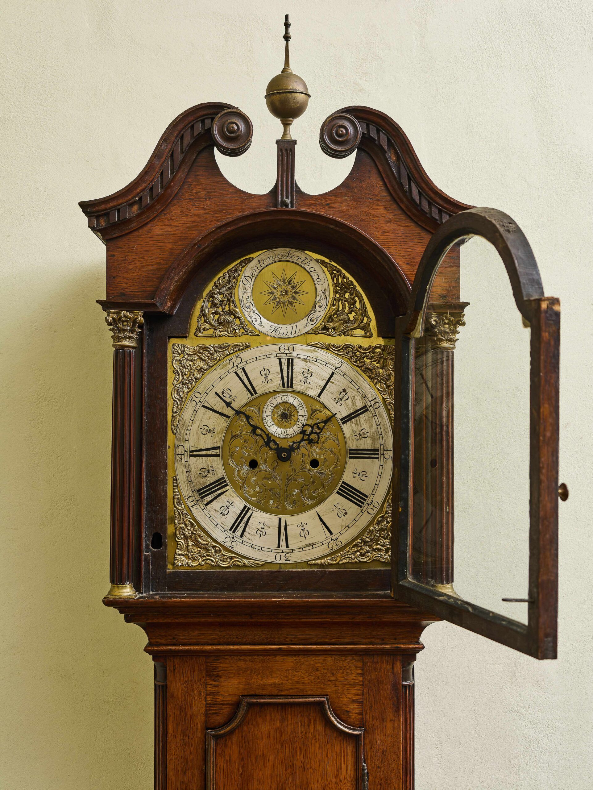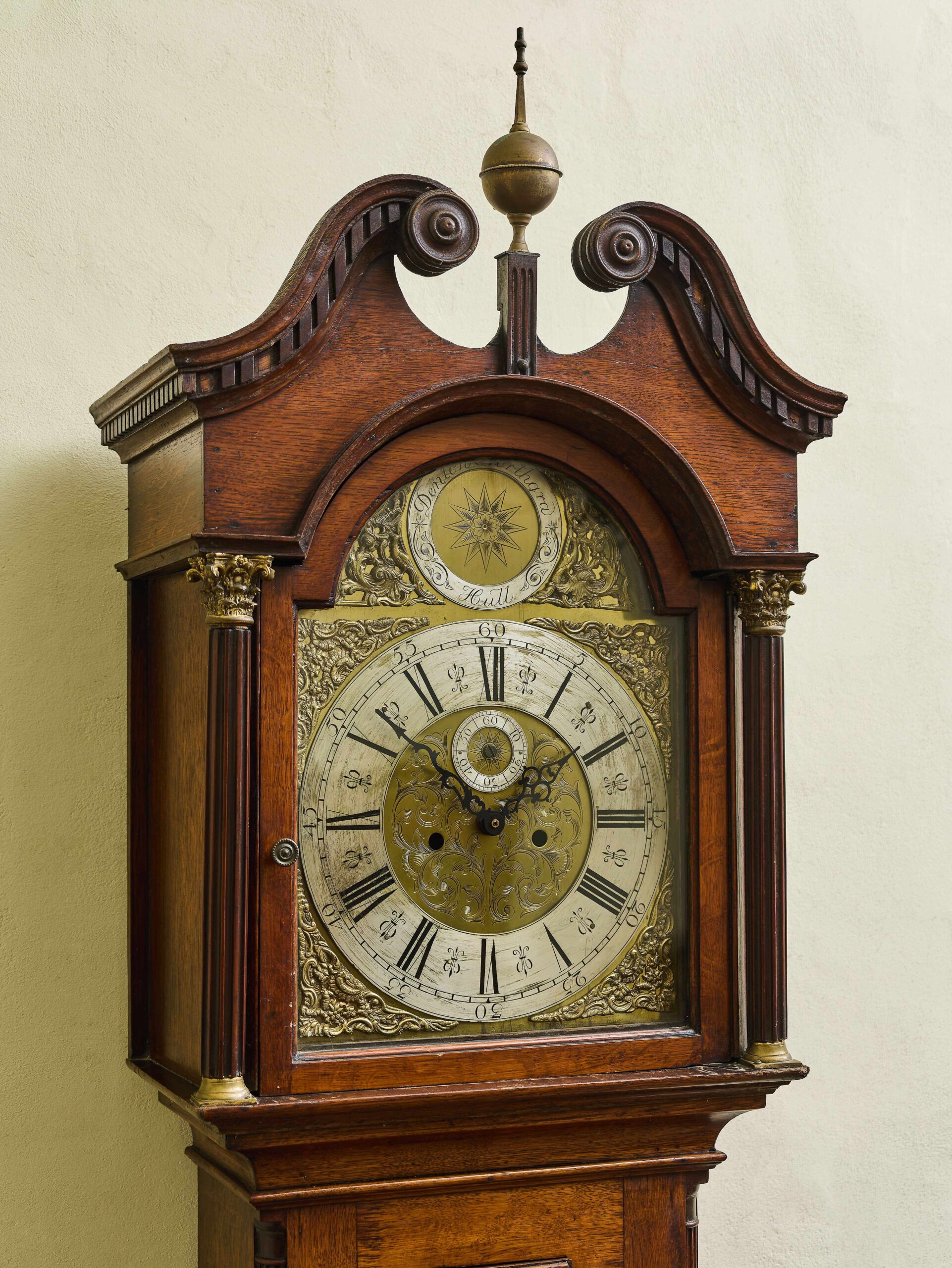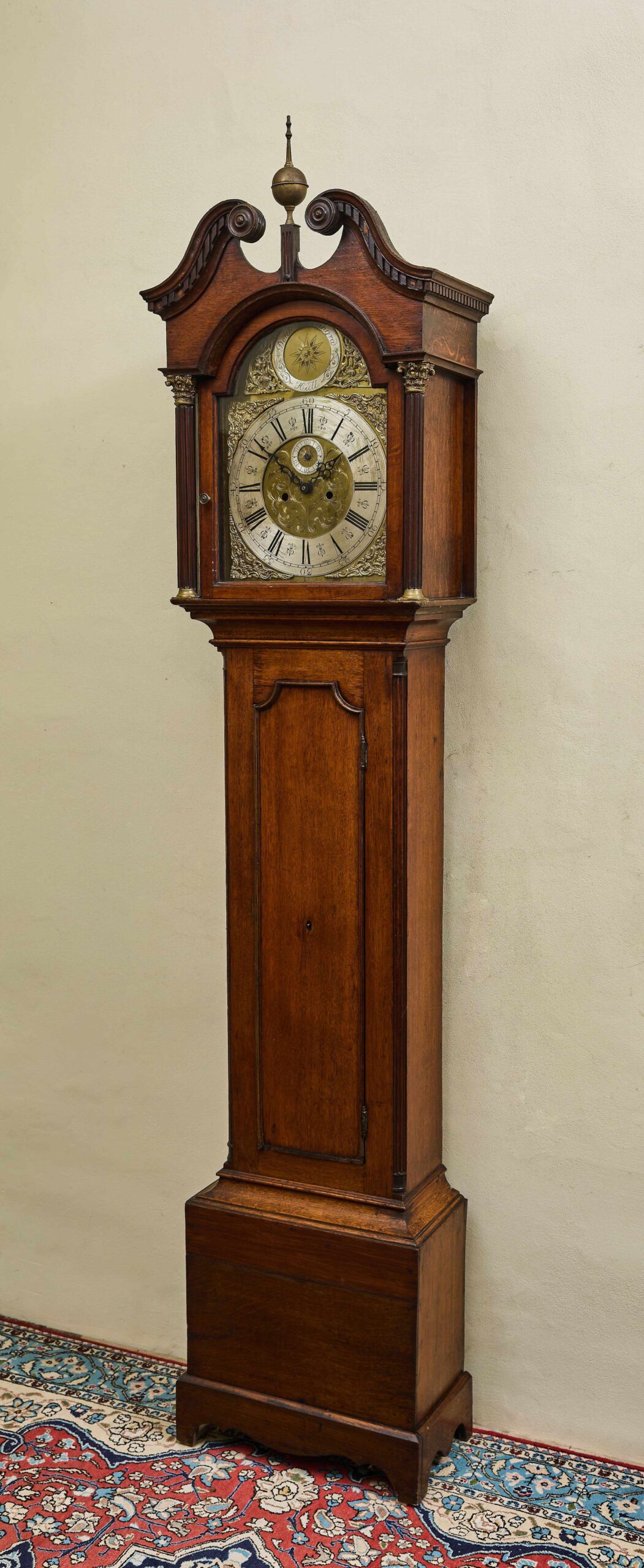 Stylové podlahové hodiny z 19. století, které spojují historický půvab s moderní praktičností. Skříň je vyrobena z kvalitního dřeva s elegantním tvarováním a klasickými architektonickými detaily, které odrážejí estetiku 19. století. Bohatě zdobený kovový ciferník s římskými číslicemi, jemným reliéfem a výraznou hvězdicí ve vrchní části je autentickým prvkem původních hodin. Hodinový stroj byl nahrazen moderním quartzovým strojkem na baterii, díky čemuž hodiny nevyžadují natahování a zůstávají tiché v chodu. Tento unikátní kus je ideální jako dekorativní doplněk historického interiéru nebo reprezentativní místnosti.